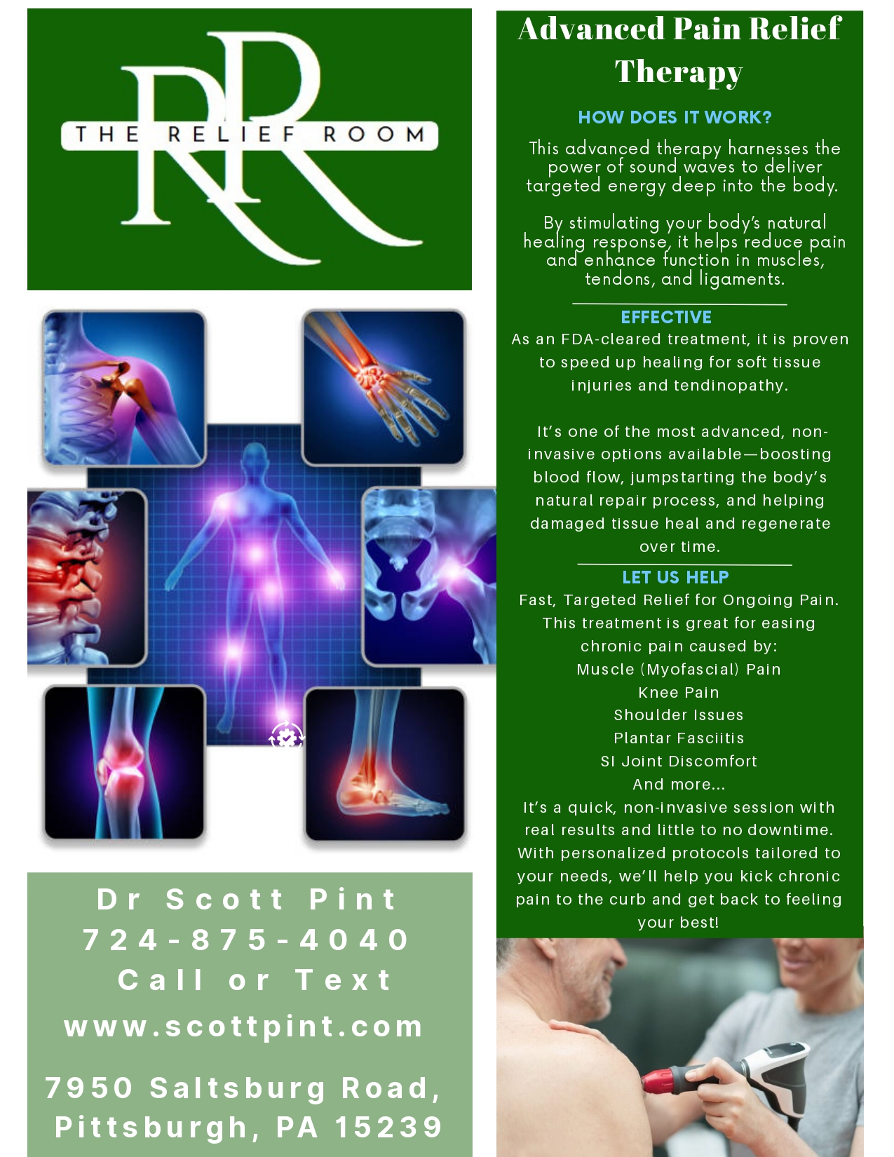 At The Relief Room in Pittsburgh, Dr. Scott Pint and his caring team provide advanced, non-invasive therapies proven to accelerate healing and relieve pain. Our relaxing, supportive environment is designed to put you at ease while offering convenient and affordable care for a wide range of conditions, from soft tissue injuries to chronic pain.